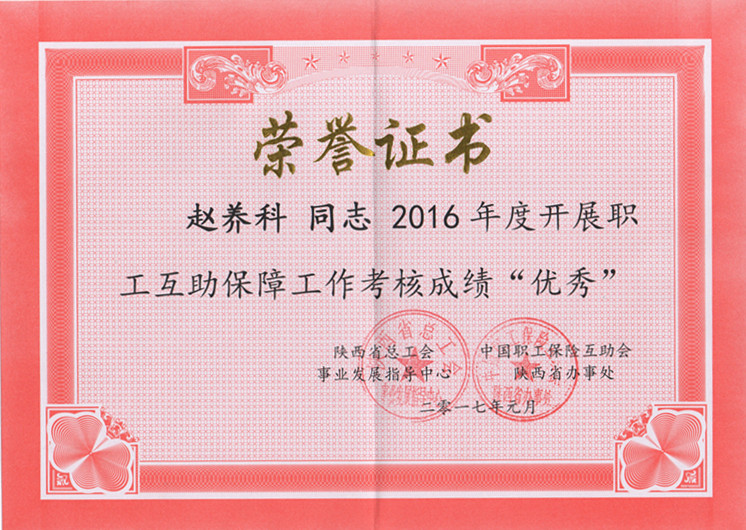 ? ?2017年1月13日,在陜西省職工互助保障工作會議上,對2016年度在陜西省職工互助保障工作中成績突出的先進單位和優秀個人進行了表彰,我隊工會被陜西省總工會事業發展指導中心和中國職工保險互助會陜西省辦事處聯合授予“先進集體”榮譽稱號,授予工會主席趙養科同志“優秀個人”榮譽稱號。